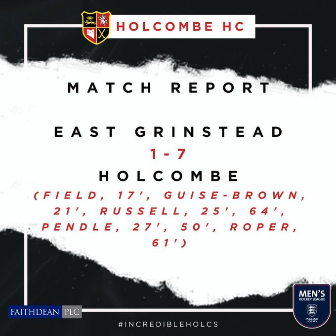Rob Field set the visitors on their way with a goal at the end of the first quarter before three goals in six second quarter minutes from Tim Guise-Brown, Tom Russell and Alex Pendle took the game away from East Grinstead. Pendle added his second Holcombe goal in the third period before Phil Roper and Russell piled further misery on to the hosts in the final quarter. Dan Faulkner scored a late consolation.