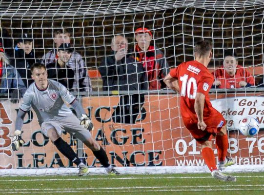 Chris Lewington was out quickly to block Pinney’s shot ensuring the teams went in level.