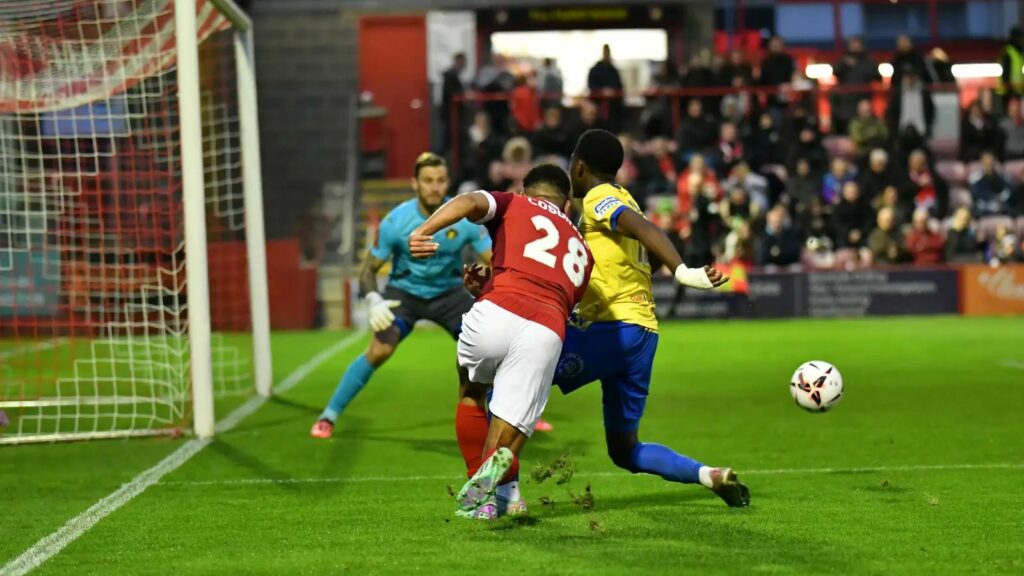 Cosgrave was just wide with another chance and Anthony Stewart looped a header just over but the advantage Fleet enjoyed was cancelled out two minutes before half-time when Davies’ tackle on Solihull skipper Jamey Osborne had the referee reaching as quickly as he could for his pocket to even up the numbers.
