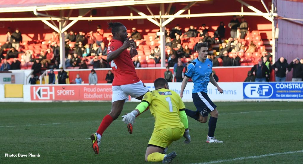 At the other end, a second advance down the left gave Kendall a run at Moulden but under pressure from Romain, he was forced into an early shot that the Fleet goalkeeper pushed around the foot of the post.