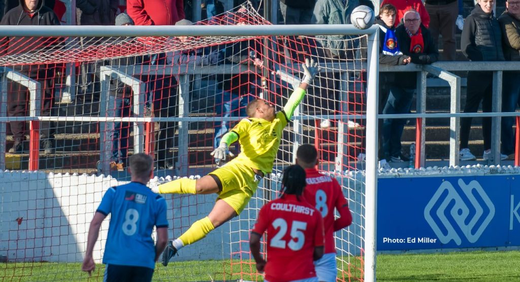 From that corner, an excellent Jack Paxman interception released Ben Chapman whose first-time touch in turn found Poleon who ran at the defence but again his shot rolled inches wide. The ball went in much the same direction when Coulthirst got away on the break and sent his effort just past Manderson’s far post.