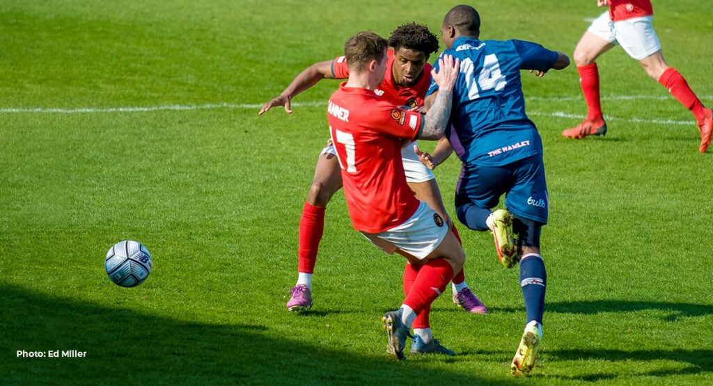 It was the visitors who opened the scoring on 10 minutes, however, after Chris Solly had conceded a free-kick. Giovanni McGregor took it and it skewed off Ronnie Vint to wrong-foot Louie Moulden and Hamlet were ahead. McGregor might have helped create a second when he played Jordan Green through but the Fleet defence hustled the Dulwich man wide and cut off his route to goal.