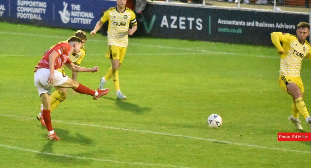 If Fleet were ruffled they didn’t show it as they immediately switched play to the other end and Edser got in a good position behind the full-back and looped an effort over Sam Johnson that took a deflection off and then hit Jack Senior to fall the right side of the far post and line to open the scoring.