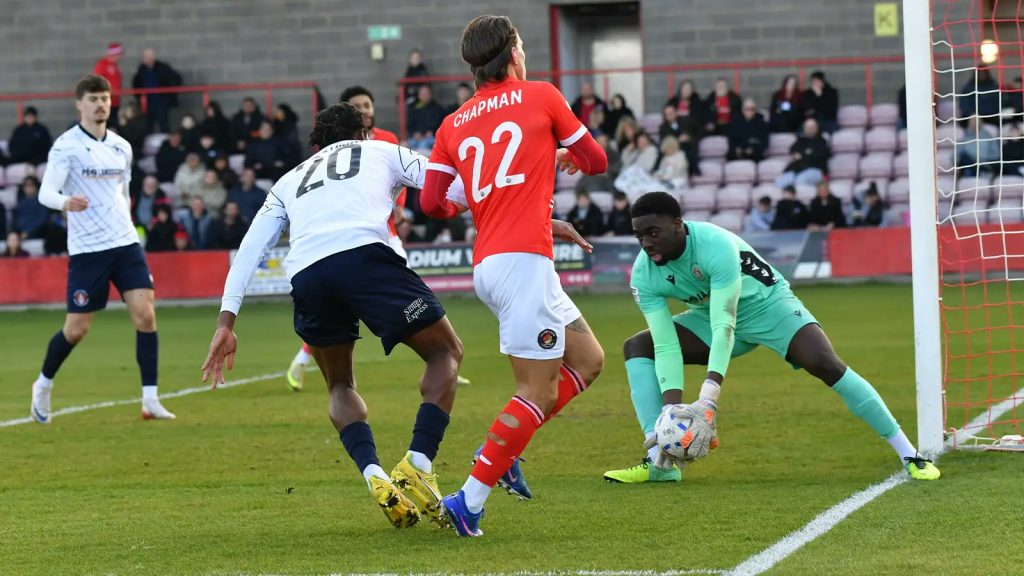 Having deserved at least the nine minutes of time added on, the Fleet – with their noses in front – could have suddenly done without it but they had several chances to extend the lead. Peake’s run was stopped on 93 minutes with calls for another penalty before Wyllie did well to battle and get in behind John Clarke but with the goal opening up for him, he was denied by Edegbe. Appiah’s run and shot also promised a third goal but whistled just past the post.