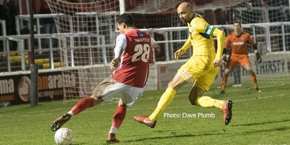 Three minutes later Cory Whitely, making his home debut, received the ball 25 yards out and he turned the defender and saw his shot go just past the post.