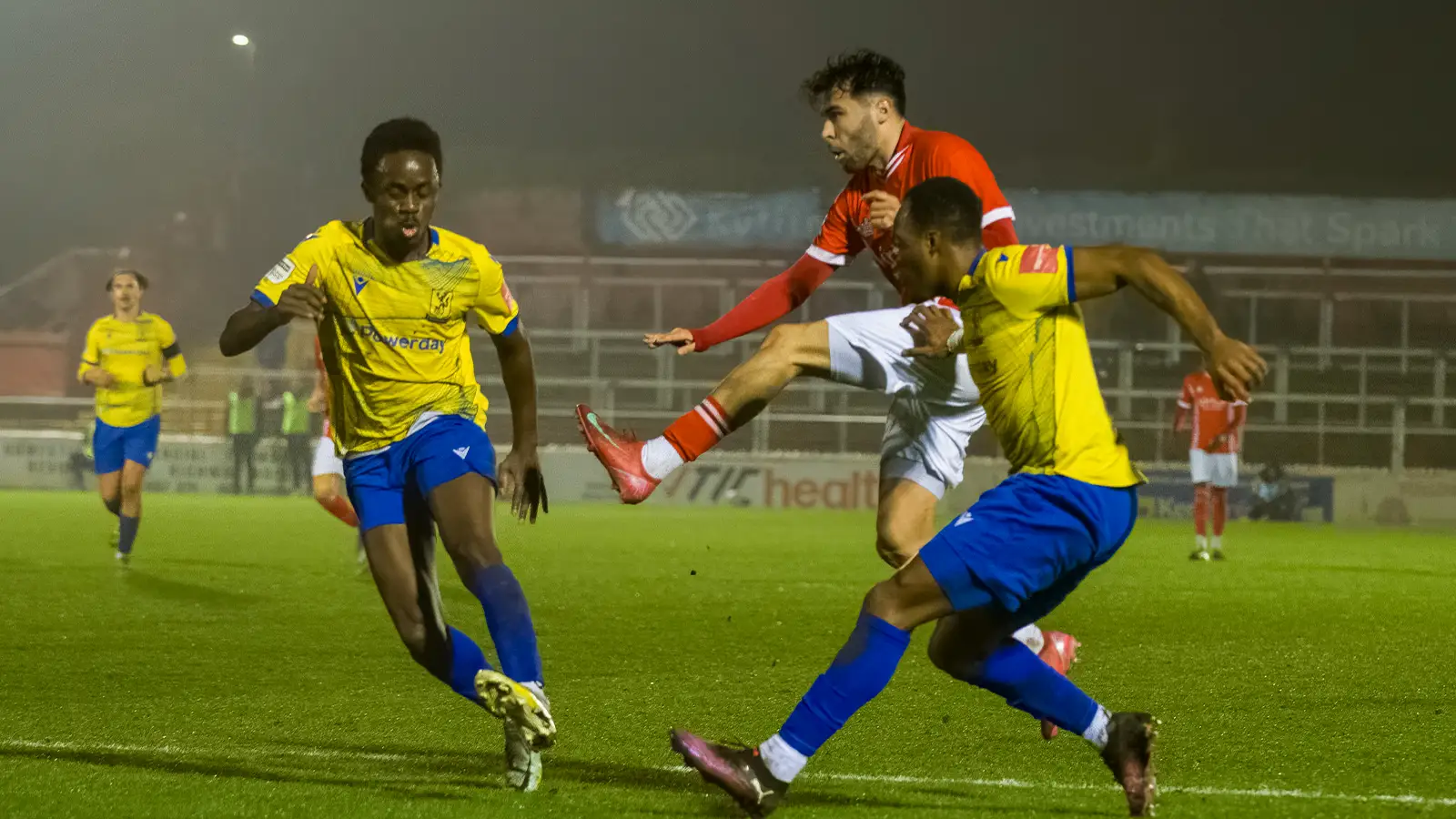 Fleet welcomed back Finlay Barnes, Tom Dallison, Mustapha Olagunju and Lennon Peake to the starting lineup on another wet evening at the Kuflink Stadium and in a scrappy opening spell, began to enjoy more forward play.