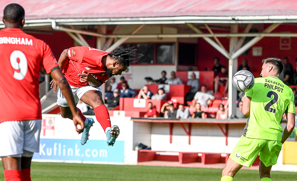 That turned out to be Chippenham who defeated Dartford in a play-off eliminator in a hard fought game at Princes Park that was decided on penalties. There were very few chances in the ninety minutes and extra time. Goalkeepers Will Henry of the Bluebirds, and Dartford’s Reice Charles-Cook took centre stage with the Darts’ keeper saving two, and Henry three. That left the impressive Alefe Santos to slot his team through.