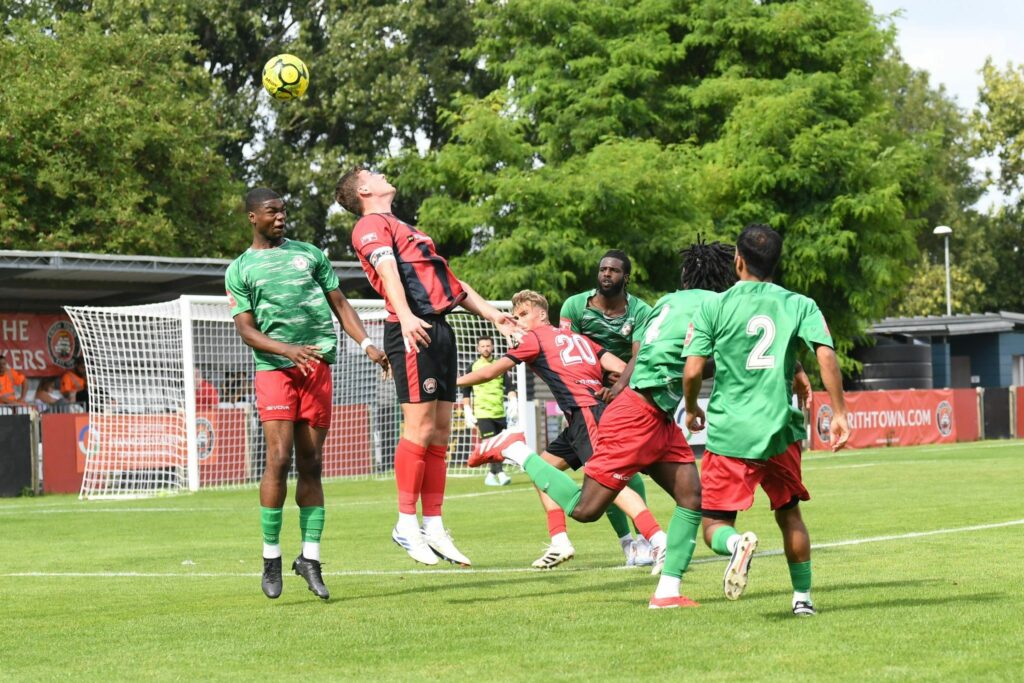 Jeffrey then hooked well over after a long Tom Ash throw was flicked on before there was a massive scramble in the Erith penalty area after Harrison Firth had been unable to hold on to a deep free kick. Defenders threw their bodies in the way to block shots before they were able to get it away.