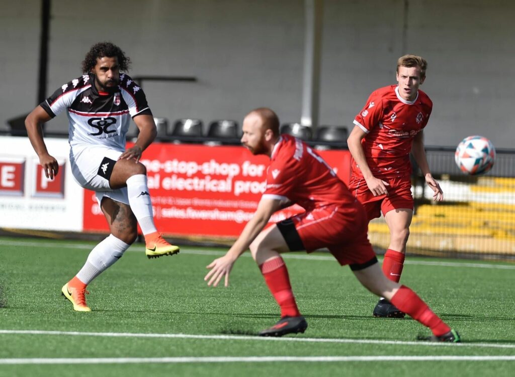 The game started with a bang when Faversham’s Payne scored after 17 seconds, the ball was played forward, and Payne saw Rilwan Anibaba off his line and lobbed him.