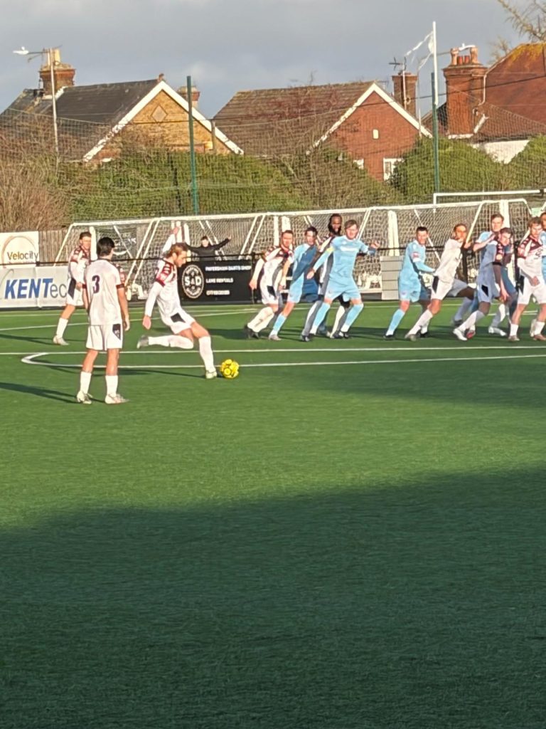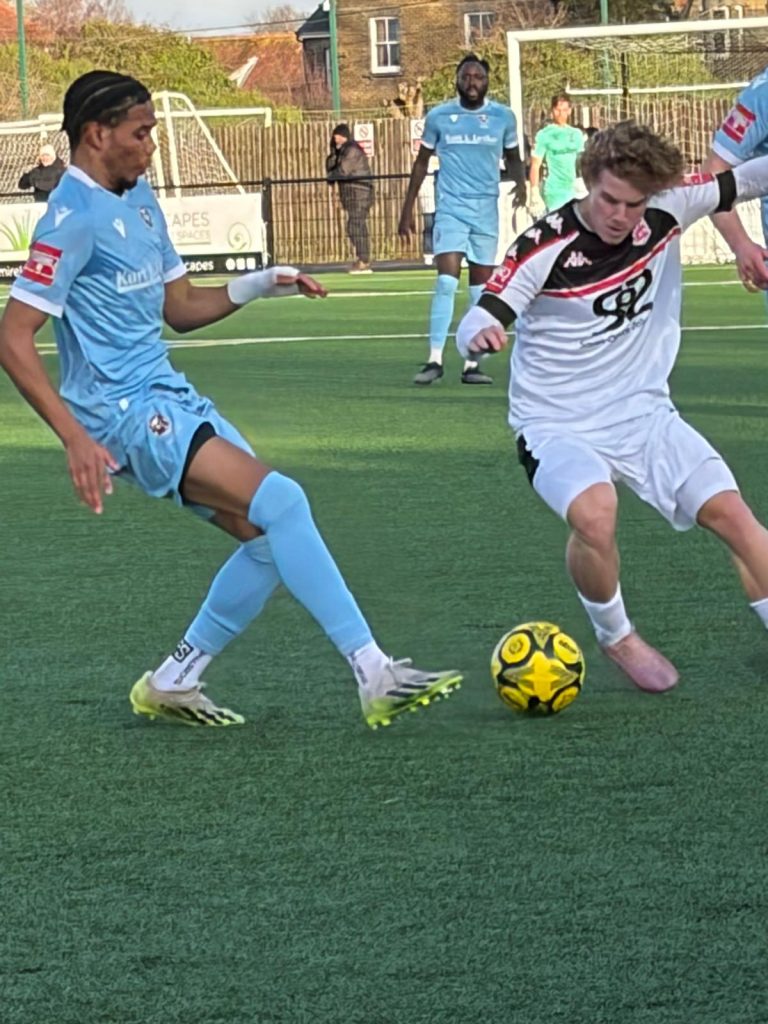 Both sides then sort to edge in from and Franzen-Jones missed the best opportunity – dragging the ball well wide of Beeney’s left post when well placed. The home side had loud appeals for a penalty as Campbell went down in the box only for referee Finnegan to book the Faversham winger for simulation!