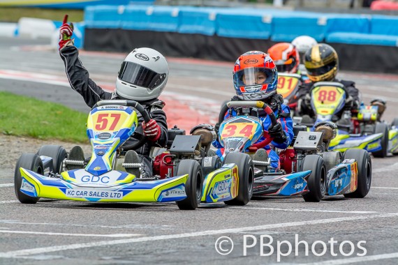 In the Junior Subaru class GMS driver Troy Beswick knew that his superb Prefinal 2 showing was going to be hard to replicate in such a competitive environment that the Junior Subaru class breeds. Zac Spence initially led and looked very capable of winning until contact from Chalie Nash at hairpin 2 on the second lap dropped him and Nash back, as both drivers were briefly delayed, Beswick and James Black came through to lead. It didn’t take long though until the pace of Spence’s Ambition kart, had him back up to 2nd. He then shadowed Beswick from lap 4 until lap 9 when contact again at the second hairpin altered the race’s course. This time it had been Spence who tried to slip inside Beswick but ultimately failed when Beswick took his usual line into the corner. Poor Spence was thrown into the air, losing valuable seconds as his kart crashed to the ground. Beswick once again had a little cushion over the rest; however he knew that he wouldn’t be able to break clear. Over the last few laps, Black pulled the pack back up to Beswick’s bumper, but by the finish Nash had pipped Black for second, Ross Connelly and Riley Stephenson finished 4th and 5th, both having very combative days moving up from lowly grid slots, proving that you can overtake in this class. It was Connelly who took the race’s fastest lap just outside of the Subaru lap record during his charge and even ended up crossing the finish line with the front of his kart in the air, after riding up over Black’s right rear corner. Tom Emson took a fine 6th place and top novice from the dejected Spence in 7th.