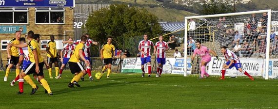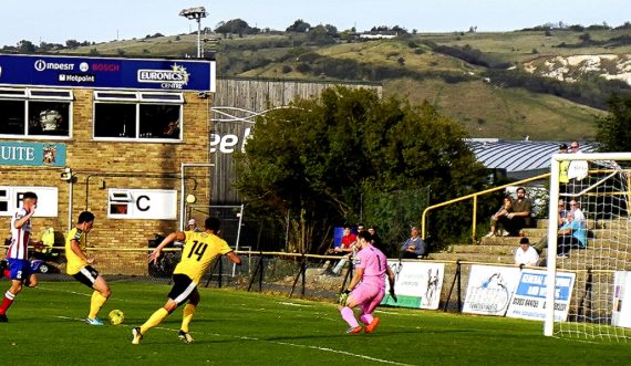 As so often, Invicta began brightly with Sam Hasler going close in first few minutes but when Tom Richards was allowed to run free on the right his shot flew past Tim Roberts and into the far corner to give Marc White’s side the lead on 13 minutes.
