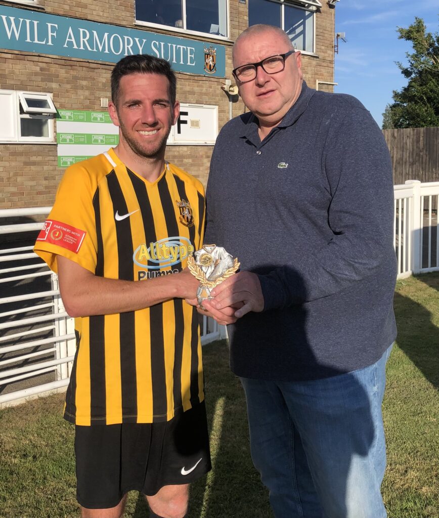 Having broken the senior Invicta goalscoring record with his 142nd goal, after the game, Ian Draycott celebrated another achievement by picking up the August ‘Goal of the Month’ Award for his strike against Worthing on the opening day of the season, from Chairman Paul Morgan. Well done Draycs!