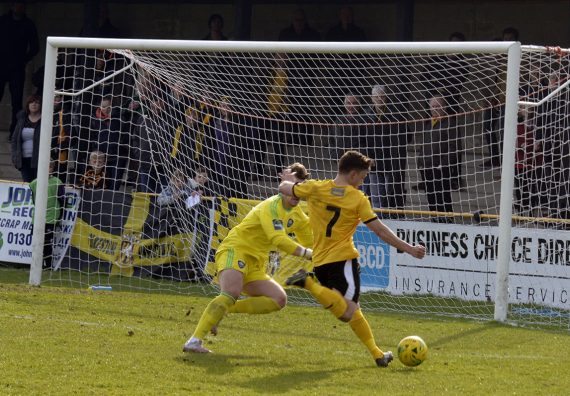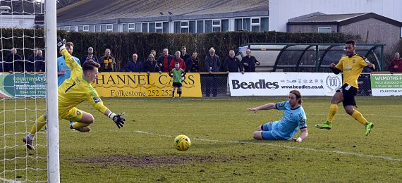 Taking the game to the opposition as he always does, leading scorer Ade Yusuff personifies and inspires the home side’s attacking spirit and it was he who drove a well struck effort just inside the near post to put Folkestone ahead on 13 minutes.
