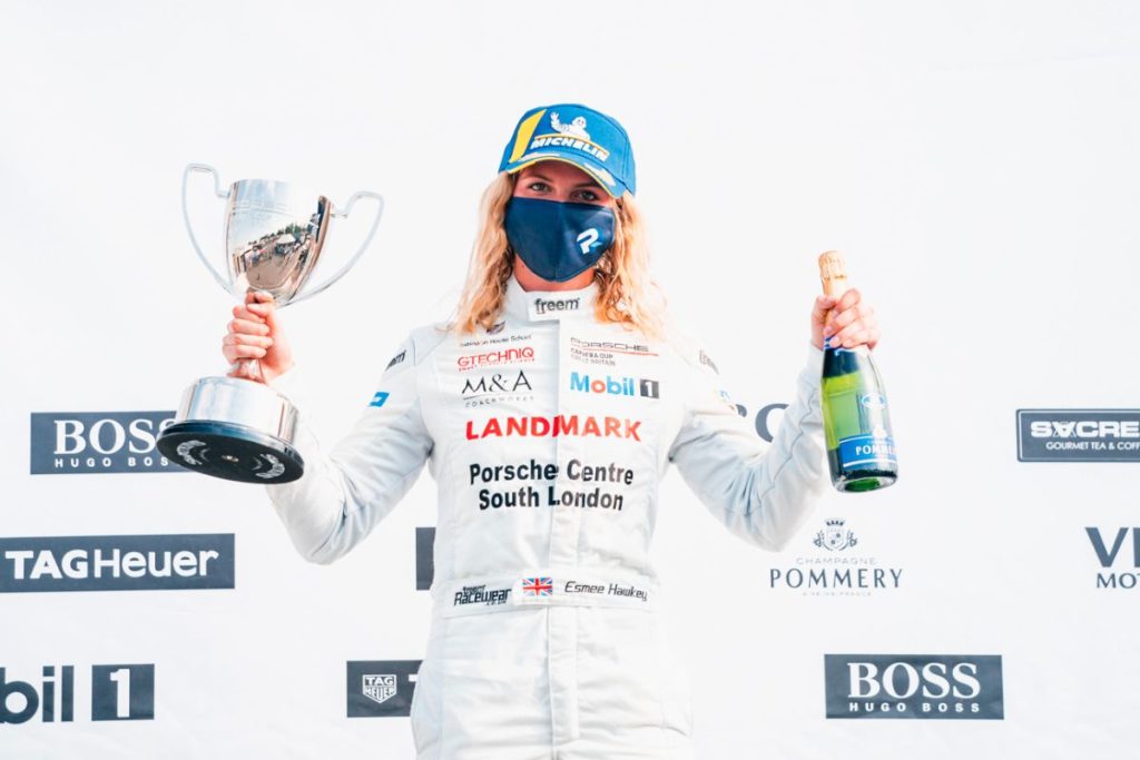 Esmee Hawkey continued her perfect start to the Porsche Carrera Cup GB season with two victories in Pro-Am and another overall podium to extend her championship lead last weekend.