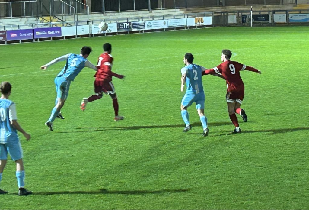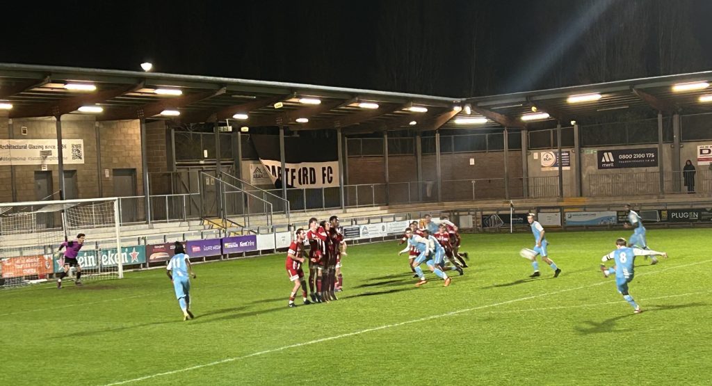 Hamelberg shot well over for the hosts then Asiedu met a deep free kick but headed over. Jack Calvert couldn’t keep his shot down for Stansfeld after a free kick was knocked out to him before Halls’ veteran striker Ryan Golding came close with a shot that was cleared off the line.