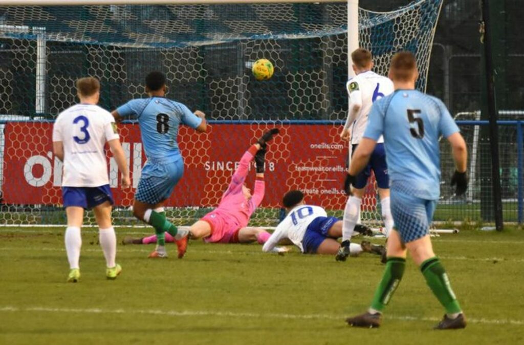 Pic :- Gavin Tomlin scores the Millers’ goal in our defeat at The Hanbury Park Stadium in 2020