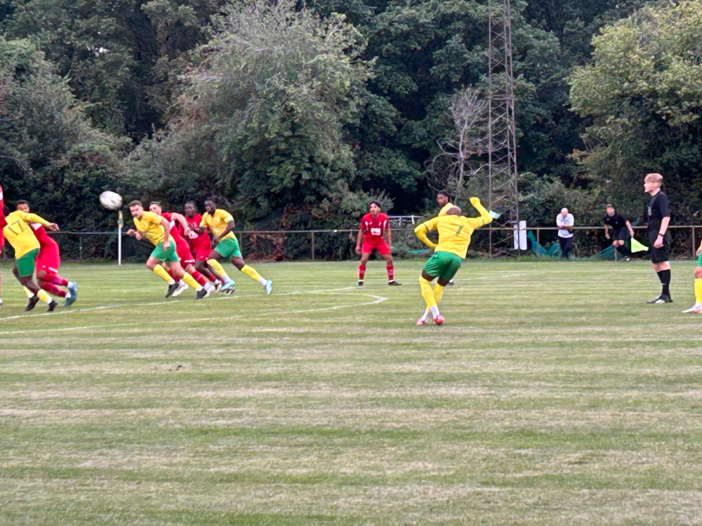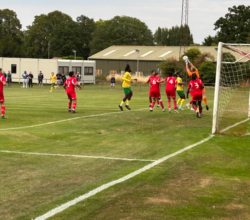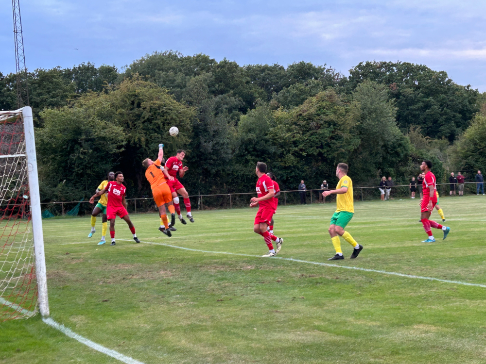 Free kicks crossed into the respective penalty areas were met by headers over the bar. Deliveries by Ward were headed over by Thomas Penfold and Christian Lawal and Bell did likewise at the other end when meeting Callum Keeble’s deep free kick. Amidst that action, Holmesdale had a huge appeal for a penalty waved away.