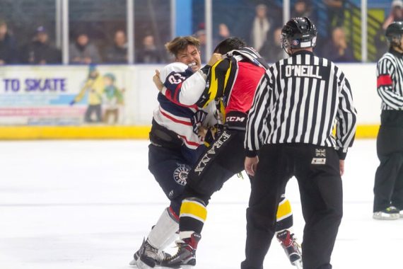 Harrison Lillis and Ryan Watt tangled after a hit against the boards. Both players dropped their gloves, Watt took a few swings at Lillis but missed. Both wrestled and landed a few punches until the linesmen split them. Both players got 2+2 for fighting and Watt received an additional two minute penalty for cross checking.