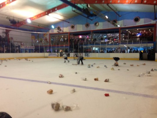 The remainder of the first period provided end to end action for the bumper crowd, but it was at the break that most of the action came as fans tossed hundreds of teddy bears onto the ice.