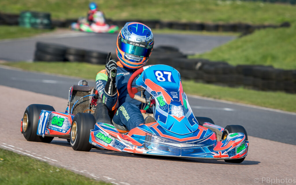 The story of the Senior Club Max was who would finish 2nd behind the blisteringly fast Thomas Lawson, as he cruised his way to Heat and Pre-final wins and then totally dominated the main Final to win by 7.5s. The 18 kart grid wasn’t full of slouches either as defending champ Michael Gibbons, Mike Ashby, Oliver Moss, Billy Watts amongst others are all more than capable of winning in the class. It was Gibbons who ran 2nd behind the impervious Lawson from the start of the Final, Ashby (ASM) was next up in 3rd and looking quick ahead of Gary Cooper and Moss who had slipped down to 5th after starting 2nd on the grid. Watts (KRM) and James Adam Pell ran 6th & 7th after the first lap with Tyler Cox and Lewis Brown next up in 8th & 9th. After 3 laps Lawson had pulled clear leaving Gibbons and Ashby to duel over 2nd place, this came to a head at the start of the 4th lap when Ashby’s black kart and the plain white kart of Gibbons went into turn 1 as one, leaving the latter spun on the outside of the corner.