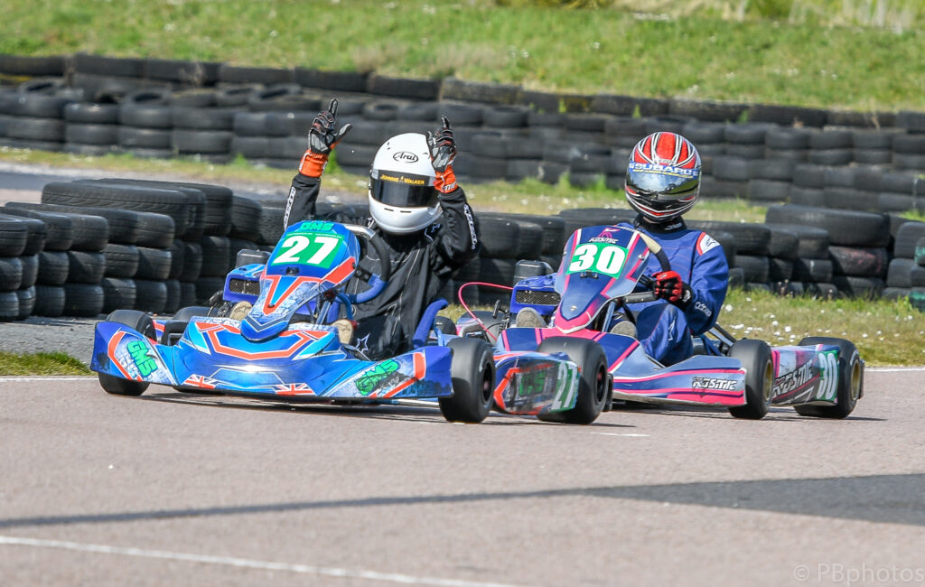 The racing was fierce at the front with Fallon and Thomas continually swapping the lead between themselves, Lovegrove-Fowler watched on from 3rd place waiting to take advantage of any mishaps ahead. As they entered the final few laps Fallon looked in control, until Thomas took advantage of the faster Mini Max karts making their way through, by snatching the lead back from Fallon on the last lap.