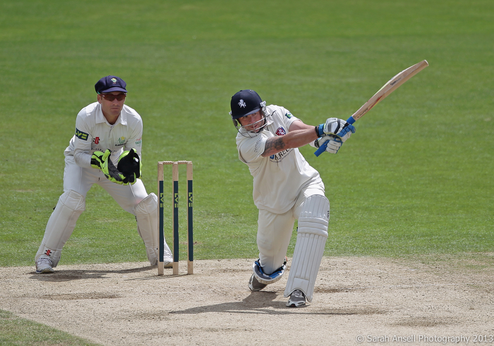 Darren Stevens of Kent scores the six that takes him to a century during Day 4 of Kent v Glamorgan LVCC Division Two at The Spitfire Ground, St Lawrence, Canterbury, England on 15 June 2013. Photo: Sarah Ansell.
