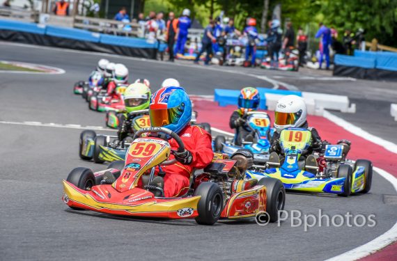 In the Honda Cadet final three drivers managed to break clear of the pack, these were led by local star Zach Ripley, with Frank Elwell and Zach Walters in his tow. Walters and Elwell traded places early on, with the latter Elwell putting his Project One kart in the lead on lap 9, before Ripley claimed the position back. Walters driving for Ambition hung on tight to Elwell and this paid off when the Project One driver received a dropped nose 10 second penalty post race. Ripley’s Evolution kart managed to pull a slight gap at the finish after 12 laps over 2nd place on the road Elwell, who ended up 12th after his penalty was enforced. Behind 2nd placed Walters, was a huge battle going on with the majority of the remaining field fighting for the remaining positions, coming out top in what would be the fight for the last podium spot, was Archie Walker – he had literally come from nowhere, making up 12 spots during the race, setting the fastest lap in doing so. Ronnie Mansfield was completely off the track in his endeavour to pass the flying Walker approaching the flag having to settle for 4th. The remaining pack finished in the order of Ryan Willis, Oscar Teuten, Declan Russell, a delayed Liam McNeilly in 8th, Mitchell Gibbons 9th and Louis Horsley completing the top 10.