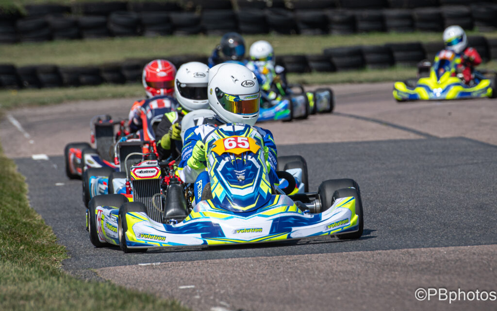The Junior Max class followed on from the Rookies and qualifying saw a stand out performance for Evolution racing’s Callum Sims, as he topped both sessions, his Q2 advantage being 0.22s over Ollie Orteu. Blueberry’s Orteu had only just scraped though Q1 in 8th (with the top 8 progressing through from Q1), but put in a good performance to take the outside front row position for the Pre Final.