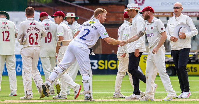 Northamptonshire fluffed the chance of an early wicket when there was a mix-up between the batters, leaving Compton scrabbling to regain his ground, but both Luke Procter’s throw in from mid-on and sub keeper Harry Gouldstone’s shy at the stumps were both slightly wide.