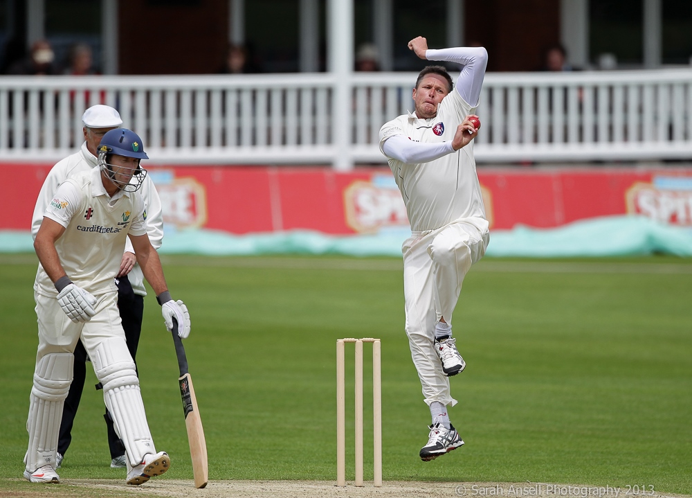 Mitchell Claydon of Kent and Stuart Walters of Glamorgan in action during Day 1 of Kent v Glamorgan LVCC Division Two at The Spitfire Ground, St Lawrence, Canterbury, England on 12 June 2013. Photo: Sarah Ansell.