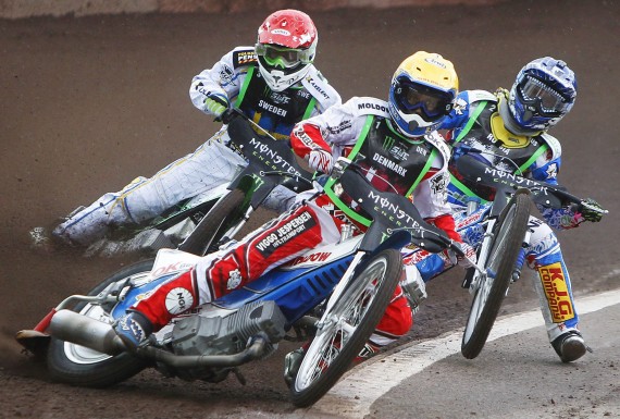 Denmark’s Nicki Pedersen competes with Sweden’s Peter Ljung and Russia’s Gregory Laguta during the 2012 FIM Monster Energy Speedway World Cup Final in Malilla