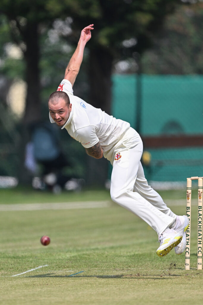 Form team Hayes, in second place, entertained Blackheath and the hopes that they would have had from the results one week earlier evaporated when they were well beaten. The visitors opted to bat first and Charlie-Sid Speller got them off to a good start with 48. Riley Ayre and Matthew Golding scored 71 each and they closed on 227 for 7. Alfie Peck’s 3 for 49 meant that he was the first bowler to go over the 30 league wicket mark this season.