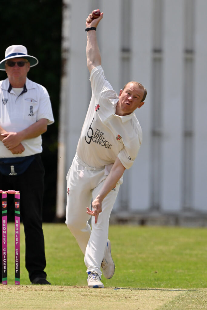 Newly promoted Bromley, in fourth place, entertained Sandwich Town in a high scoring thriller. They asked their visitors to bat first and Sidney Thomson scored 49 before Rory Smith cracked 101 not out. He was supported by a quick fire 62 from Alex Smith and 30, a run a ball 30, by Tom Chapman as the innings closed on 299 for 6. Although James Butterfill didn’t take any wickets, conceding just 18 from ten overs stood out.