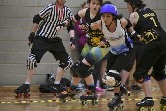 As both jammers fought hard to get through solid walls of blockers, who largely play defensive roles to stop the jammer getting through, Kent’s blockers also withstood some solid offence from Windsor’s players.