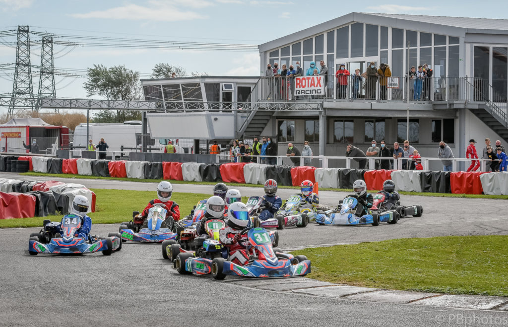 17 karts were entered in the Junior Rotax class and after the morning’s qualifying session Callum Romaine took pole position for the first heat in his Meyado backed kart. Things didn’t go so well after that as he tangled with Jayden Neal-Holder dropping both to the back of the field. It was Oliver Bullion who took heat 1 from Max Lee and Rory Burke. Heat 2 went to Lee this time from Bullion and Daniel Hughes.