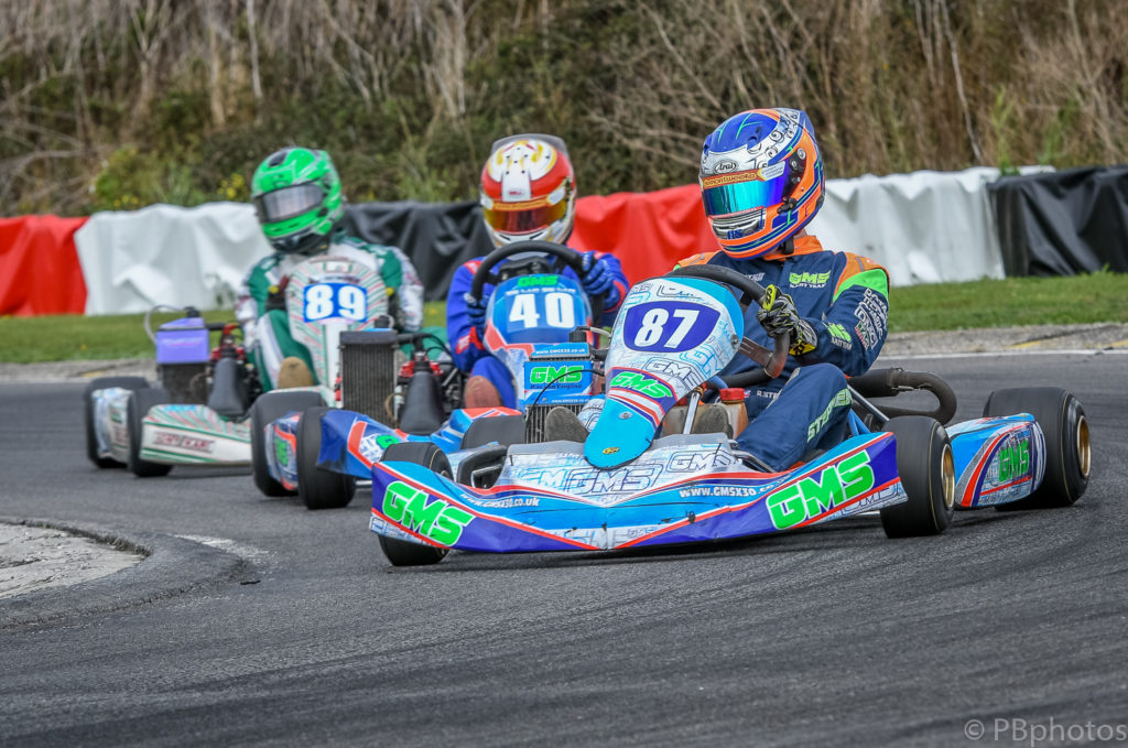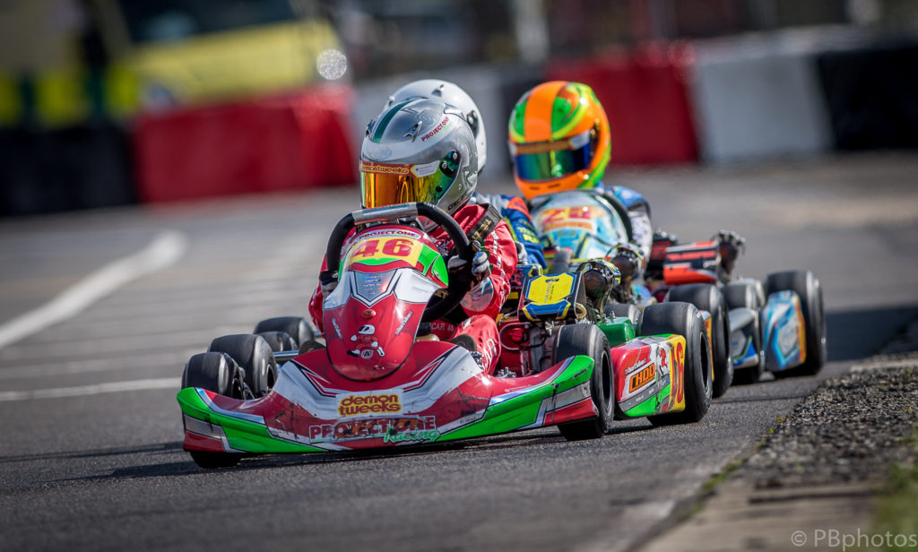 The ten kart Honda Cadet proved very competitive during the heats with William Murphy taking the first and Owen Neave the second victories. Neave’s CHDD Evolution kart led Oscar O’Sullivan’s Project One kart away from the standing start, Murphy’s Ambition motorsport tucked in behind to form a 12 wheel train over the opening laps.