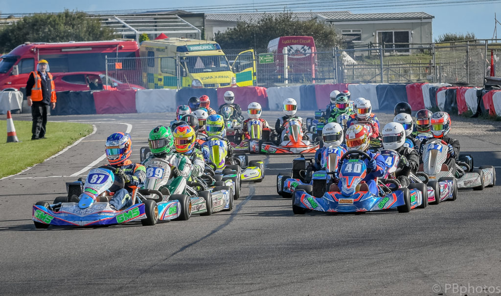 A crash involving several karts curtailed the first start of the final before they had even crossed the start line, with Morgan and Jack Minter-Young coming off the worse.