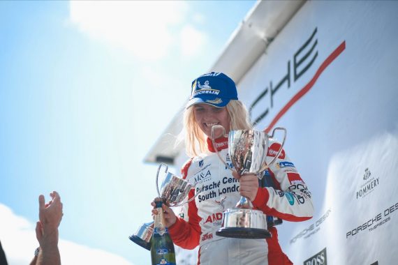 Esmee Hawkey recorded a well-earned first victory in the challenging Porsche Carrera Cup GB at Oulton Park last weekend.