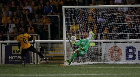Four minutes later Maidstone nearly scored when Joe Pigott’s free kick from 20 yards on the left side was tipped over the bar by Cole.