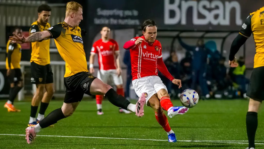 Against the run of play, Maidstone opened the scoring on 13 minutes with their first real chance of the match. Mo Faal’s initial shot deflected across goal to force a save from Matt Hall but arriving on to the loose ball was Jephte Tanga who slotted the ball home to give the Stones an early advantage.