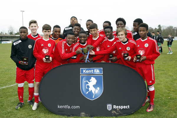 Kent FA Under 14 Youth Cup Final. Meridian VP v Thamesmead. Meridian VP in red.