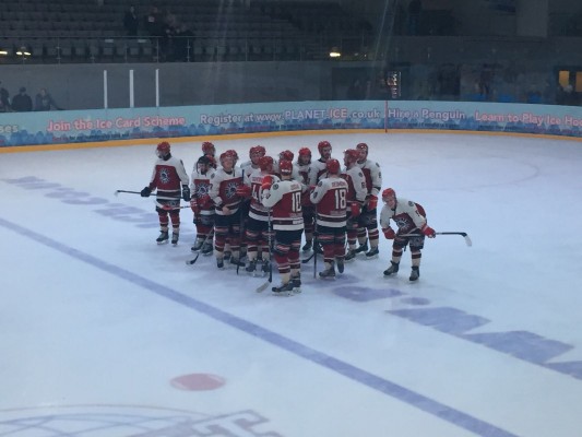 Due to a mix-up behind the scenes which meant the netminder equipment didn’t travel from Kent, Damien King had to watch from the sidelines whilst his gear was rushed-up the M1.
