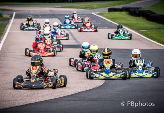 With both Joseph Knight and Reece Lomax taking a Pre Final win each, we knew we were in for a thrilling Clubman final. Lomax led the 16 kart field away in his RHP kart, while behind him DNL teammates Knight and Chris Doble tussled over 2nd and 3rd positions, that was until Knight managed to turn in some good mid race laps which brought him onto the tail of his adversary in front. By lap 10 of 12 he had forged his way past but then on the last lap went a little too defensive, allowing Lomax, Leon Frost ( who had climbed up from 6th) and Doble, to swamp him. Lomax chose a deeper line out of one of the infield hairpins and this gave him the drive around the outside of Knight onto the infield straight, to take the lead which he held until the chequered flag. Knight was just 0.3 seconds behind with Frost in 3rd, Doble took a well-deserved 4th, from Max Solarski in 5th and Luke Heyward in 6th. Leon Frost took the fastest lap during his climb up through the field.