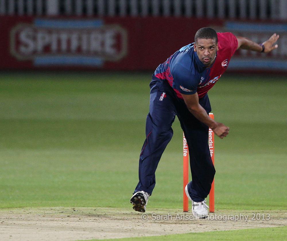 Vernon Philander of Kent in action during the Friends Life T20 South Group match between Kent & Middlesex at The Spitfire Ground, St Lawrence, Canterbury, Kent on 28 June 2013. Photo by Sarah Ansell.