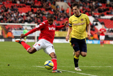 Charlton Athletic’s Bradley Pritchard and Carlisle United’s Paul Thirlwell battle for the ball