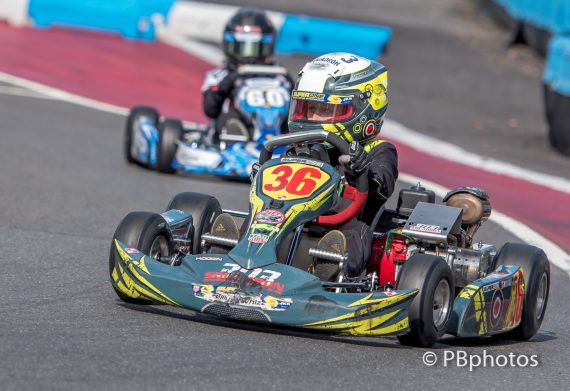Ryan Haines took the wins in the morning heats and then went onto beat his nearest adversary Mike Ashby in the final by just over a second. Ashby had managed to close the gap to his Haines during the heats but despite holding on during the early laps, ultimately fell just shy after 15 laps in the Final. Steve Boret enjoyed tussling with the pair in the first couple of heats until problems prevented him from starting the final. Novice Christopher Kalvashoti was the remaining Rotax runner in 3rd. The only X30 class entrant Michael Hafford had enjoyed racing with the Rotax runners, until handling gremlins held him back in the final. Haines secured the fastest lap on lap 13.