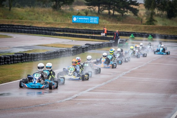 16 karts set off in the increasing rain for the Junior Max final, these teenagers were headed all race by Charlie Bennett, who seemed to find grip on the sinuous Swale circuit that the others couldn’t. Liam Carter in second place ended up 11 seconds behind Bennett, his position was hard fought as he had Sean Berry, Harry Gent, Jenson Harvey and Michael Kemsley to fend off, as they finished in this order at the Chequered flag entertaining the damp crowd throughout their 12 lap final.