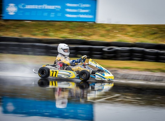 The Junior Subaru class was up next and this race gave us a dominant winner in Jenson Harvey, his kart’s set up proving perfect in the greasy conditions to allow him to win by nearly 6 seconds. Nathan Jeffery and Max Goodwin broke clear of the pack to take the final podium positions, with Warwick Daden crossing the line at the top of the snarling Subaru powered pack, Joshua Young and Chris Bridle were glued to Daden’s rear bumper at the finish line.