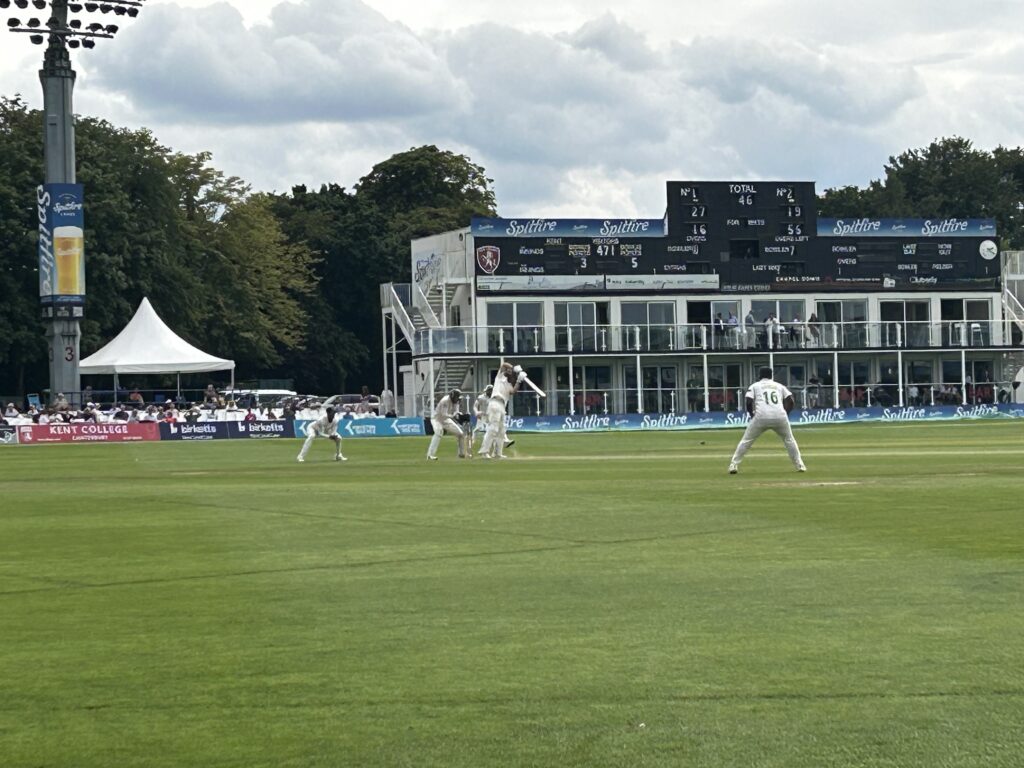 Play began 15 minutes late due to rain and no wickets fell during a truncated morning session, which saw Kent move to 217 for three.
